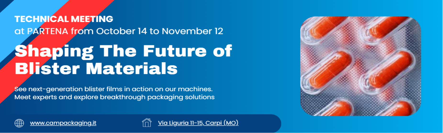 L’azienda invita a un’esclusiva “Open House” autunnale, che si terrà direttamente nella nostra sede Partena. Si tratta di un’occasione unica per vedere con i propri occhi le soluzioni più innovative nel blister packaging.